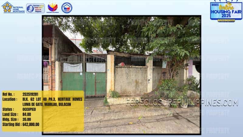 - Property Location: BLK. 62 LOT 40 PH.3, HERITAGE HOMES LOMA DE GATO, MARILAO, BULACAN