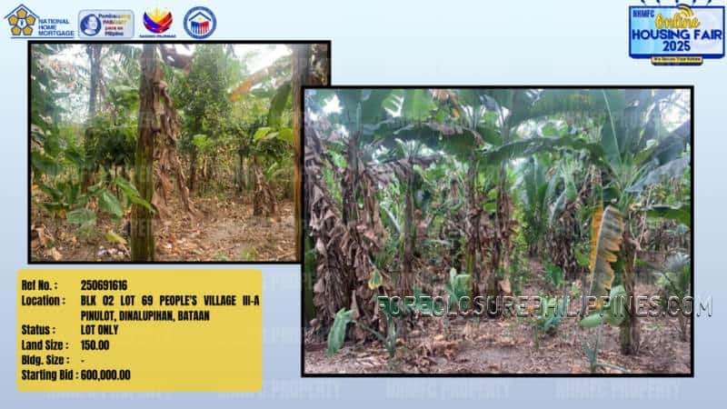 - Property Location: BLK 02 LOT 69 PEOPLE’S VILLAGE III-A PINULOT, DINALUPIHAN, BATAAN