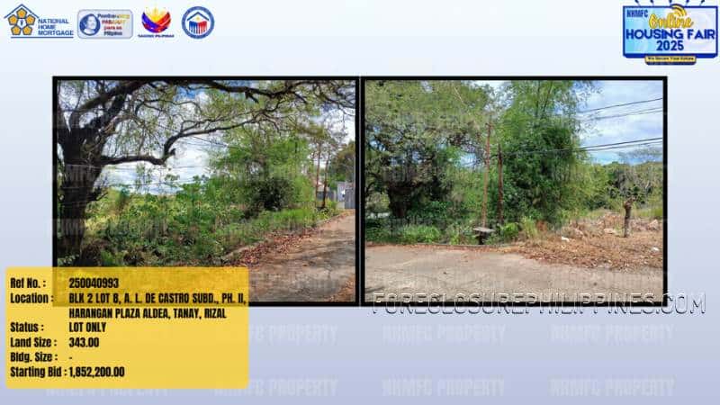 - Property Location: BLK 2 LOT 8, A. L. DE CASTRO SUBD., PH. II, HARANGAN PLAZA ALDEA, TANAY, RIZAL