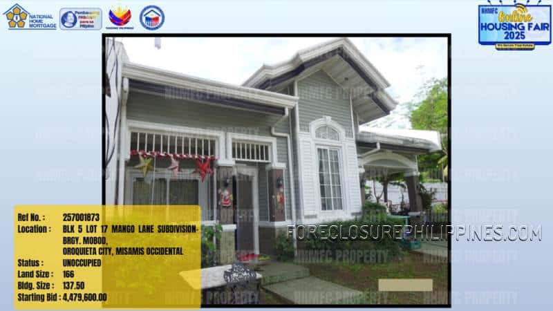 - Property Location: BLK 5 L 17 MANGO LANE SUBDIVISION-BRGY. MOBOD, OROQUIETA CITY, MISAMIS OCCIDENTAL