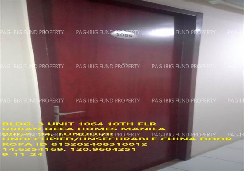 - Property Location (address): Unit 10F-64 10TH Flr. 3-Q75 URBAN DECA HOMES MANILA BARANGAY 94, TONDO I/II, NCR, CITY OF MANILA, FIRST DISTRICT, 1012