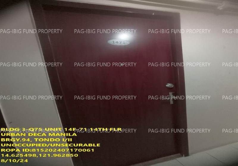 - Property Location (address): Unit 14F-71 14TH Flr. 3-Q75 URBAN DECA HOMES MANILA BARANGAY 94, TONDO I/II, NCR, CITY OF MANILA, FIRST DISTRICT, 1012