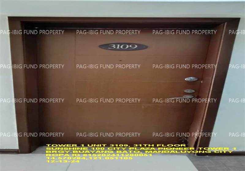 - Property Location (address): Unit 3109 31ST Flr. SUNSHINE 100 CITY PLAZA – PIONEER TOWER 1 BUAYANG BATO, CITY OF MANDALUYONG , NCR, SECOND DISTRICT, 1550