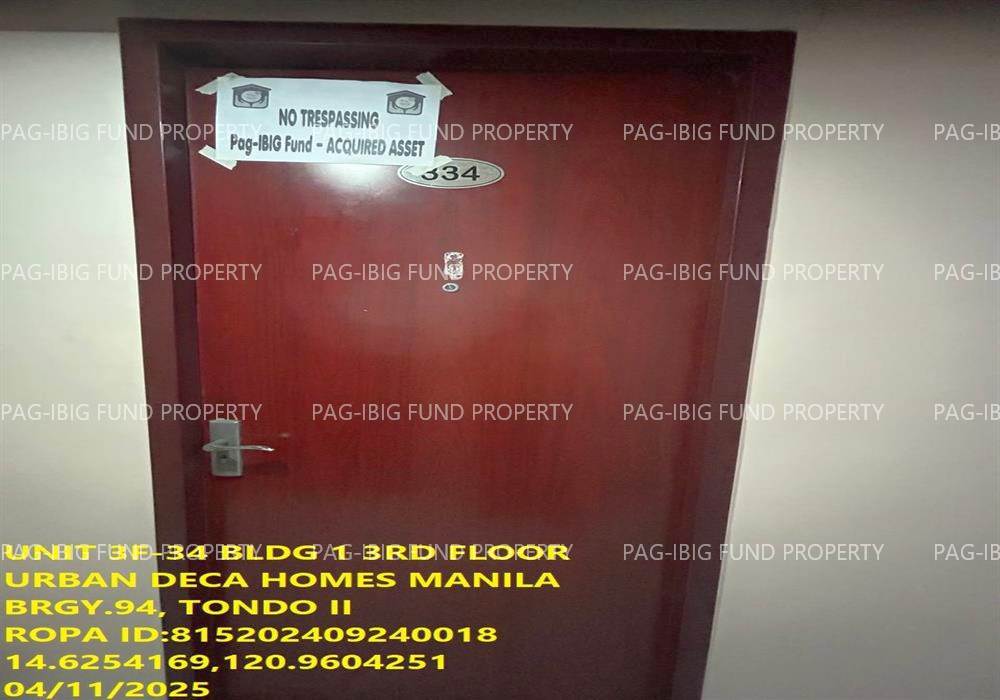 - Property Location (address): Unit 3F-34 3RD Flr. 1-Q75 URBAN DECA HOMES MANILA (BUILDING 1, 2, 3) BARANGAY 94, TONDO I/II, NCR, CITY OF MANILA, FIRST DISTRICT, 1012
