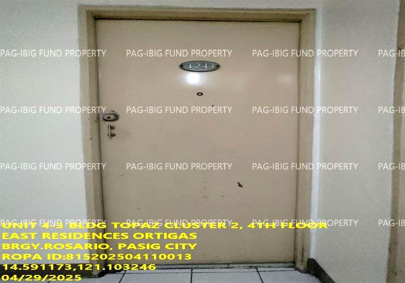 - Property Location (address): Unit 4-3 4TH Flr. TOPAZ, CLUSTER 2 EAST RESIDENCES-ORTIGAS ROSARIO, CITY OF PASIG, NCR, SECOND DISTRICT, 1609