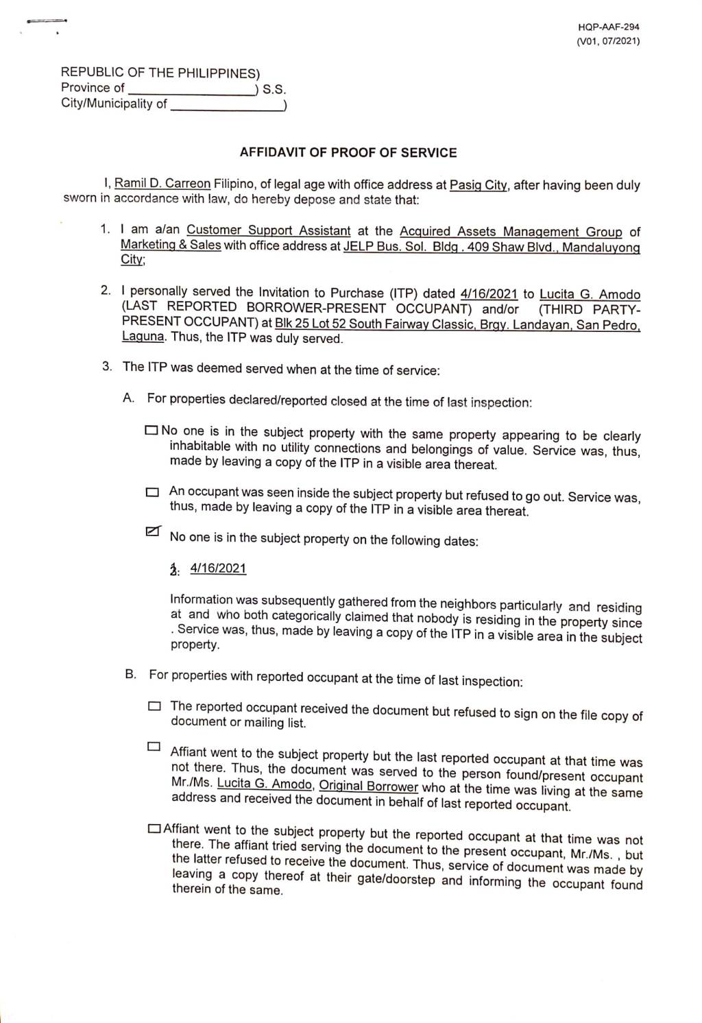 - Property Location (address): Lot 52 Blk. 25 Phase 1 SOUTH FAIRWAY HOMES CLASSIC LANDAYAN, SAN PEDRO, LAGUNA, 4023