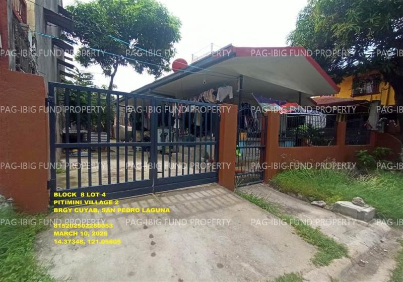 - Property Location (address): Lot 4 Blk. 8 PITIMINI VILLAGE 2 CUYAB, CITY OF SAN PEDRO, LAGUNA, 4023