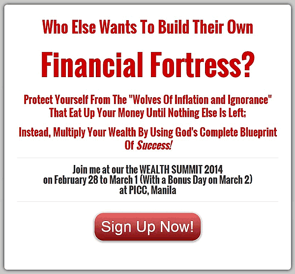 Bo Sanchez’ Wealth Summit 2014 will be happening this coming February 28, 2014  to March 2, 2014 (Friday-Saturday-Sunday), at the PICC, Manila. This year’s 2-day Wealth Summit (plus 1 “bonus” day) will be about building your Financial Fortress where you will get 14 Blueprints for Success. Don’t forget to use the 10% discount code below.