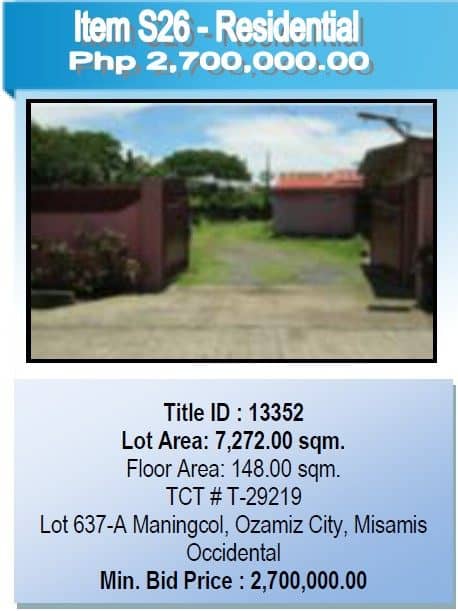 The Philippine National Bank Special Assets Management Group shall conduct a public sealed bidding of PNB foreclosed properties from Bukidnon, Misamis Occidental, Misamis Oriental, and Lanao Del Norte, on February 11, 2015 (Wednesday), 2:00pm. The venue shall be the PNB Oroquieta Branch, Sen. Jose Ozamis St., Lower Lamac, Oroquieta City, Misamis Occidental. Download the complete listing below.