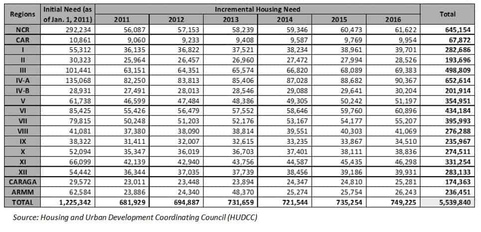 It is important to note the projections of the Housing and Urban Development Coordinating Council (HUDCC) of the annual increase in demand. While this projection is up for revision in the light of the recent Census of Population and Housing and the Family Income and Expenditure Survey, its national and regional presentation is helpful in assessing the demand for housing.