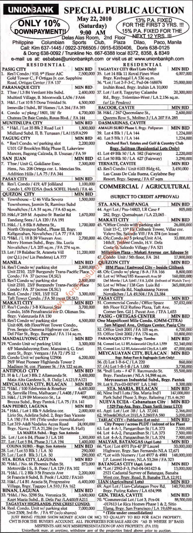 UnionBank of the Philippines will conduct another half-day Public Auction of real estate properties on Saturday, May 22, 2010 at Delas Alas Room 2nd Floor Philippine Columbian Sports Club, Plaza Dilao, Paco, Manila at 9:00 AM.