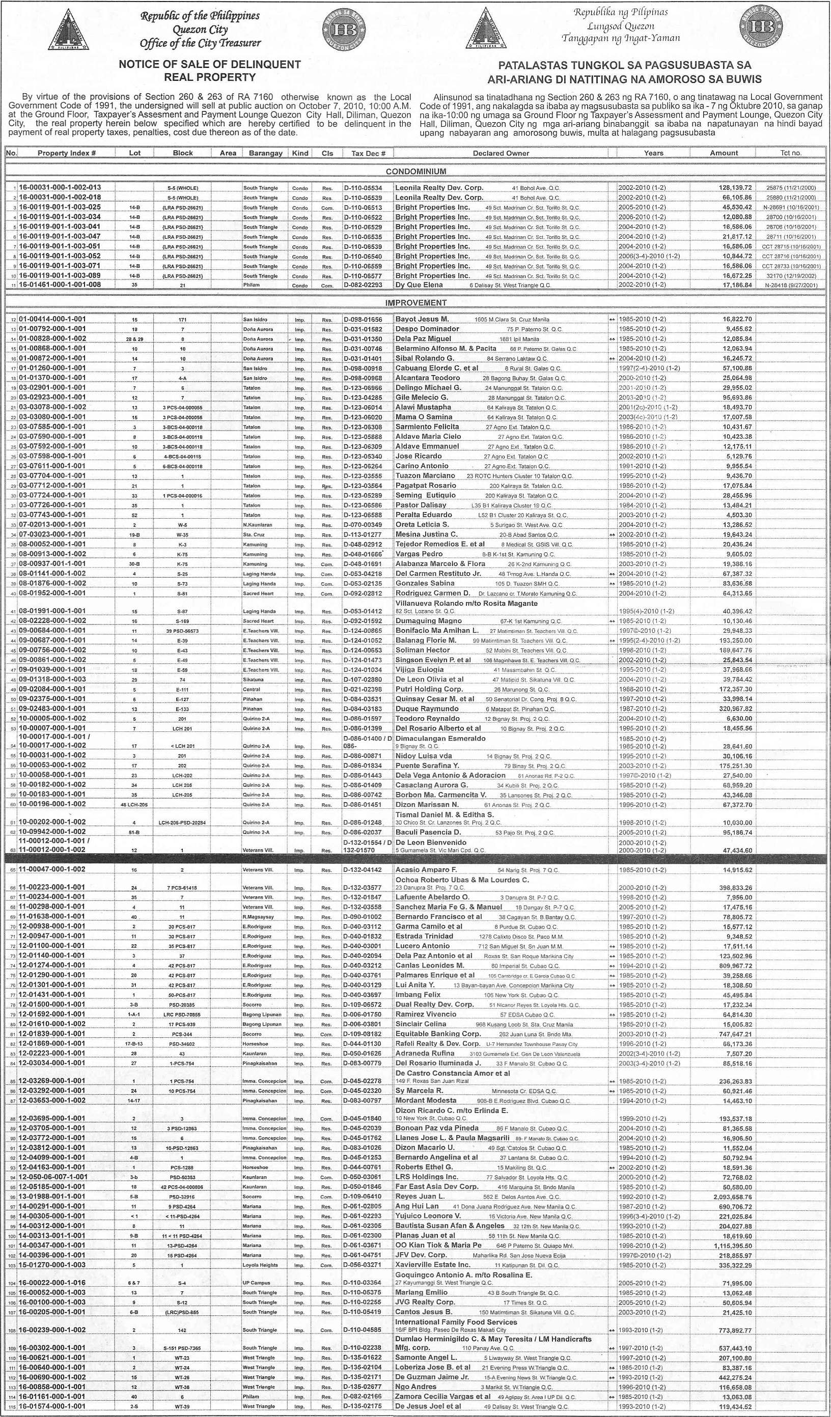 As a follow-up to my previous post on the notice issued by the Quezon City Treasurer’s Office, this post contains the complete list of tax delinquent properties for sale through public auction on October 7, 2010, by virtue of Section 260 and 263 of RA 7160, otherwise know as the Local Government Code of 1991. The venue of the auction shall be the Ground Floor, Taxpayer’s Assessment and Payment Lounge, Quezon City Hall, Diliman, Quezon City, Philippines. The tax foreclosure auction starts at 10:00am.