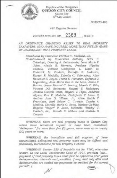 Based on Quezon City Ordinance No. SP-2363, taxpayers that own real properties (this includes land, improvements, and machinery) which have incurred more than 5 years worth of delinquency,