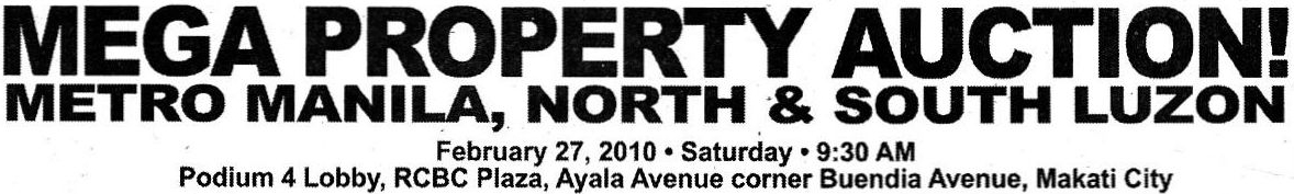 More than a hundred foreclosed properties are set to be sold through public auction in the upcoming Mega Property Auction of RCBC and RCBC Savings Bank. This auction of foreclosed condos, house and lots, townhouses, and other types of real estate will happen on February 27, 2010, Saturday, 9:00AM, at the Podium 4 Lobby, RCBC Plaza, Ayala Avenue corner Buendia Avenue, Makati City, Philippines.