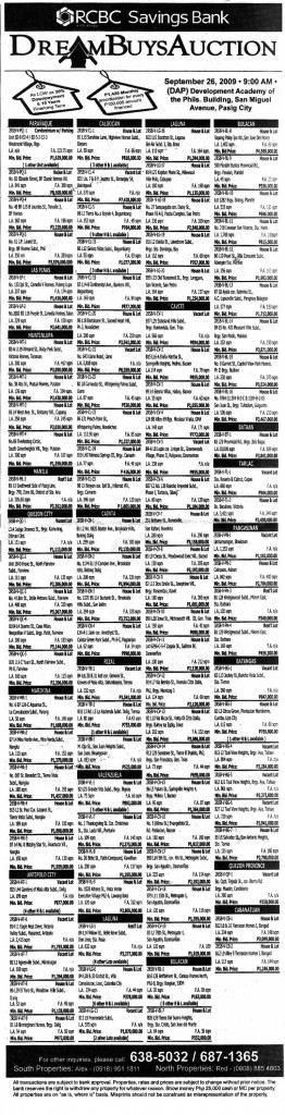 Click here to download the complete listing of RCBC Savings Bank repossessed houses included in their Dream Buys Auction on September 26, 2009 or just click on the image above. Don’t forget to read the fine print at the bottom of the auction announcement.