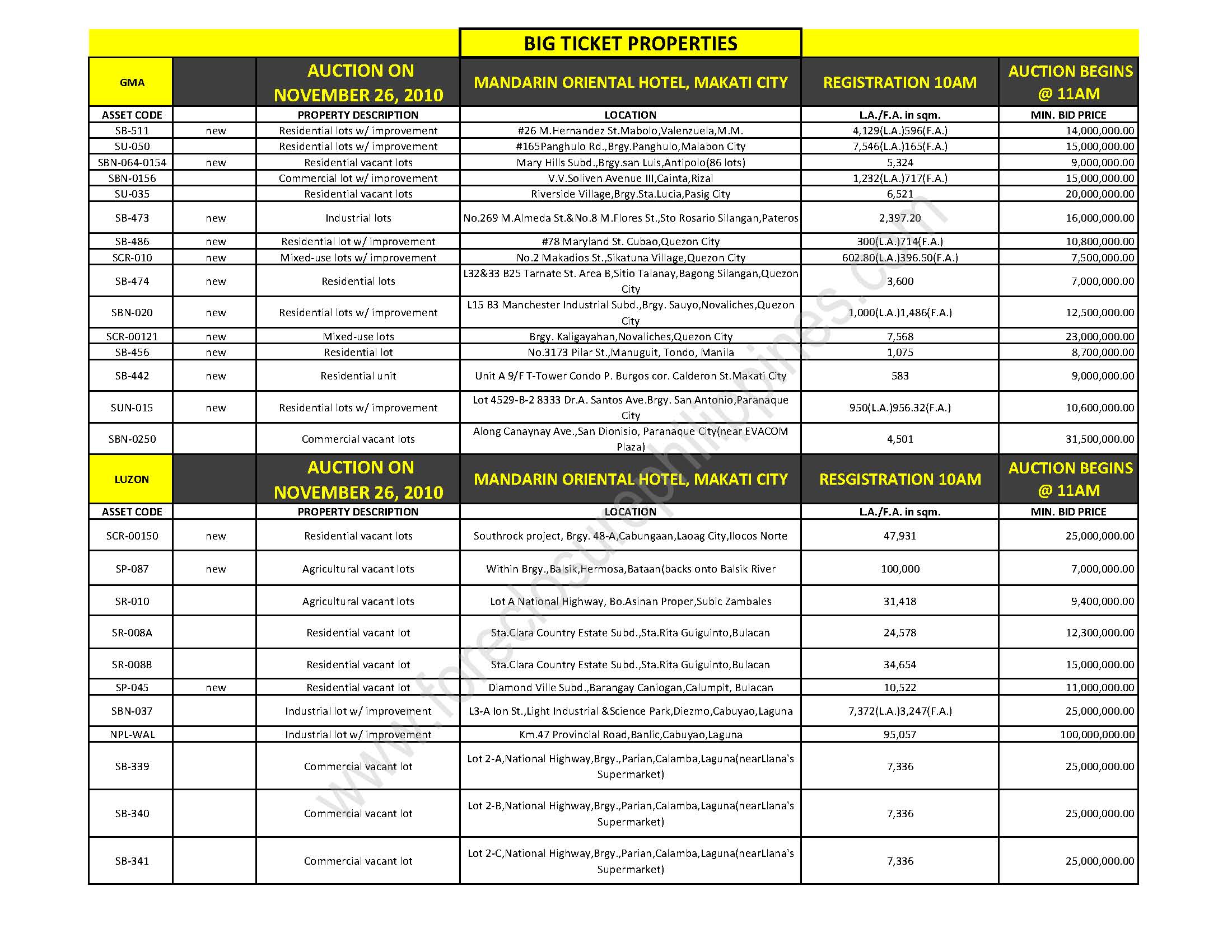 The GMA and Luzon Big Ticket properties open auction will be held on November 26, 2010, at the Mandarin Oriental Hotel, Makati City, Philippines. Registration starts at 10:00am and the auction proper starts at 11:00am.