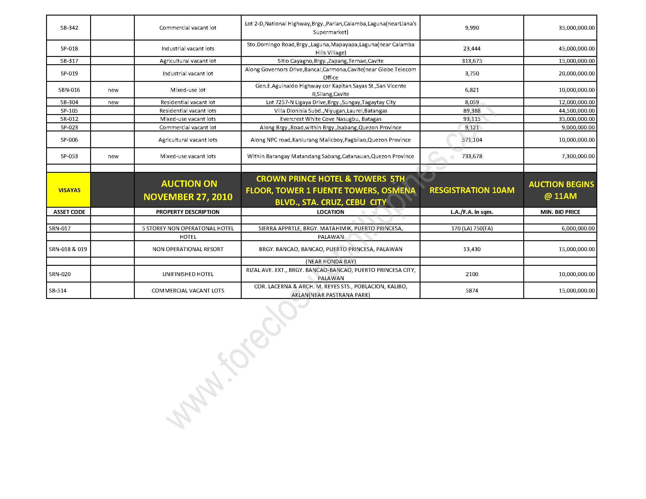 The open auction for the Visayas Big Ticket properties will be on November 27, 2010, at the Crown Prince Hotel & Towers, 5th floor, Tower 1 Fuente Towers, Osmena Blvd., Sta. Cruz, Cebu City, Philippines. Registration starts at 10:00am and the auction begins at 11:00am.