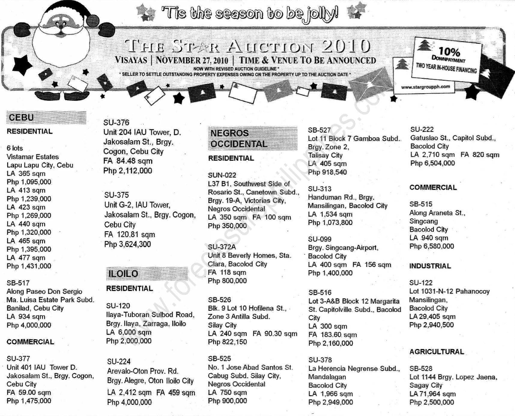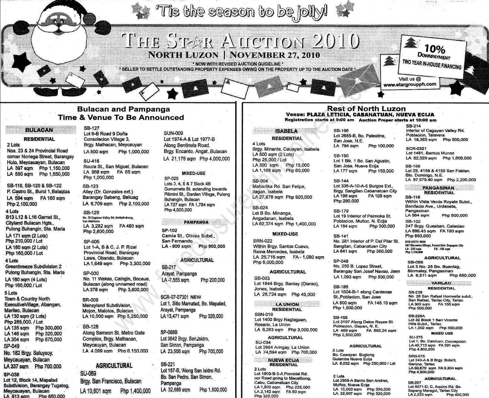 Following their auction held last November 20, 2010, the Star Group will be having open auctions of their big ticket properties located in the Greater Manila Area (GMA), Luzon areas, and Visayas areas.