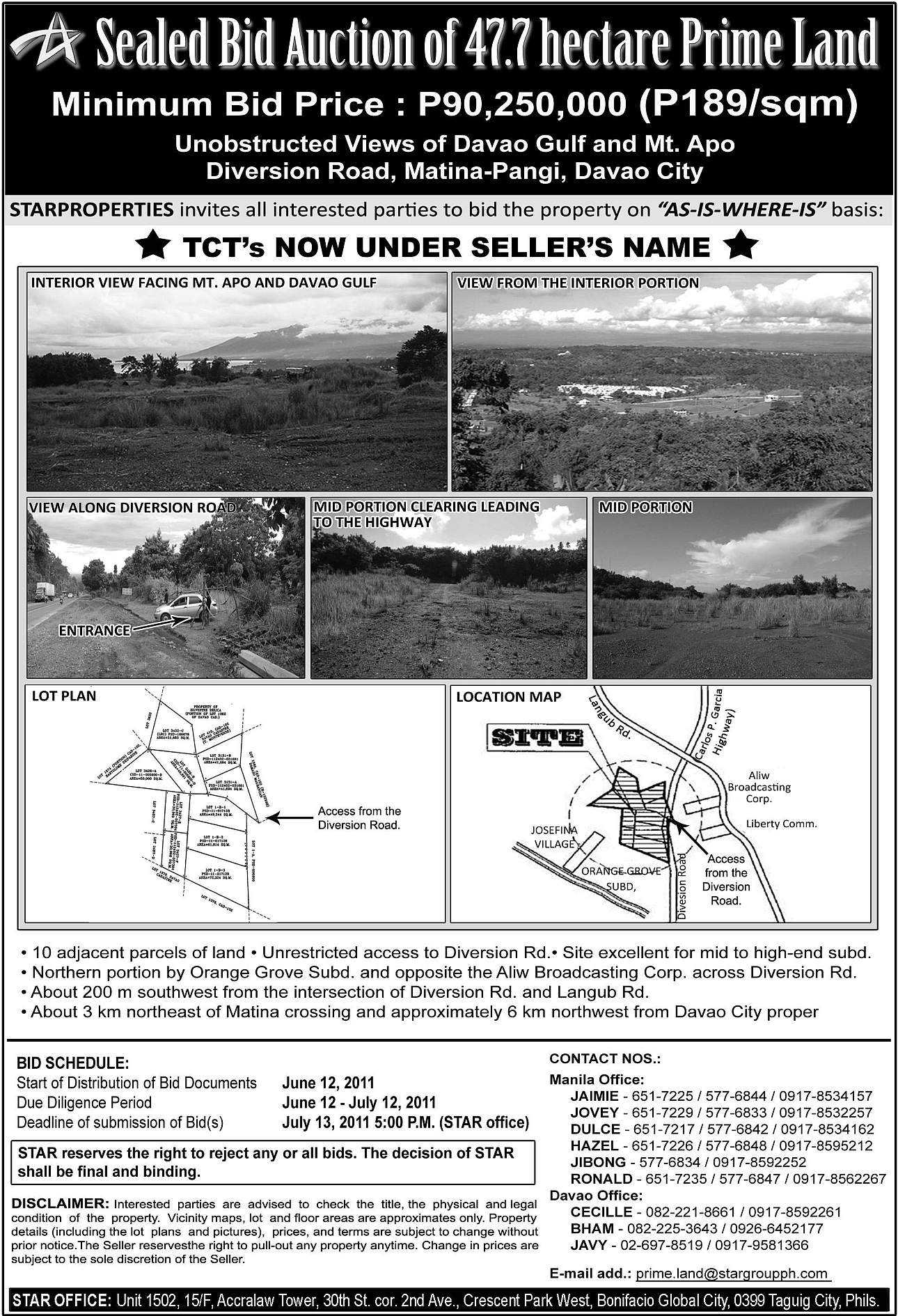 PDF version:ย Star Properties Sealed Bidding of 47.7 Hectares Prime Land in Davao on July 13, 2011
