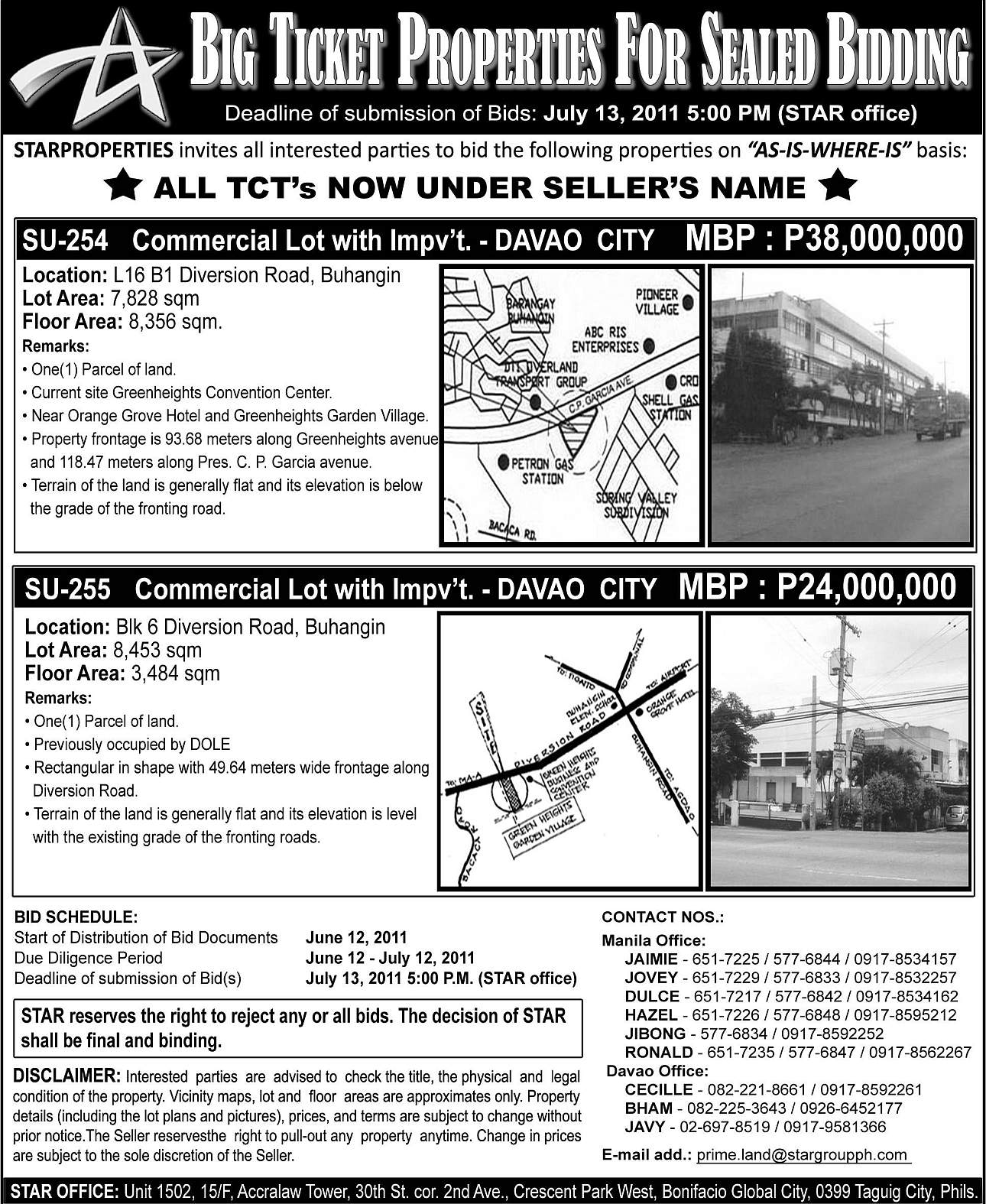 PDF version:ย Star Properties Sealed Bidding Big Ticket (2 Davao Commercial) on July 13, 2011