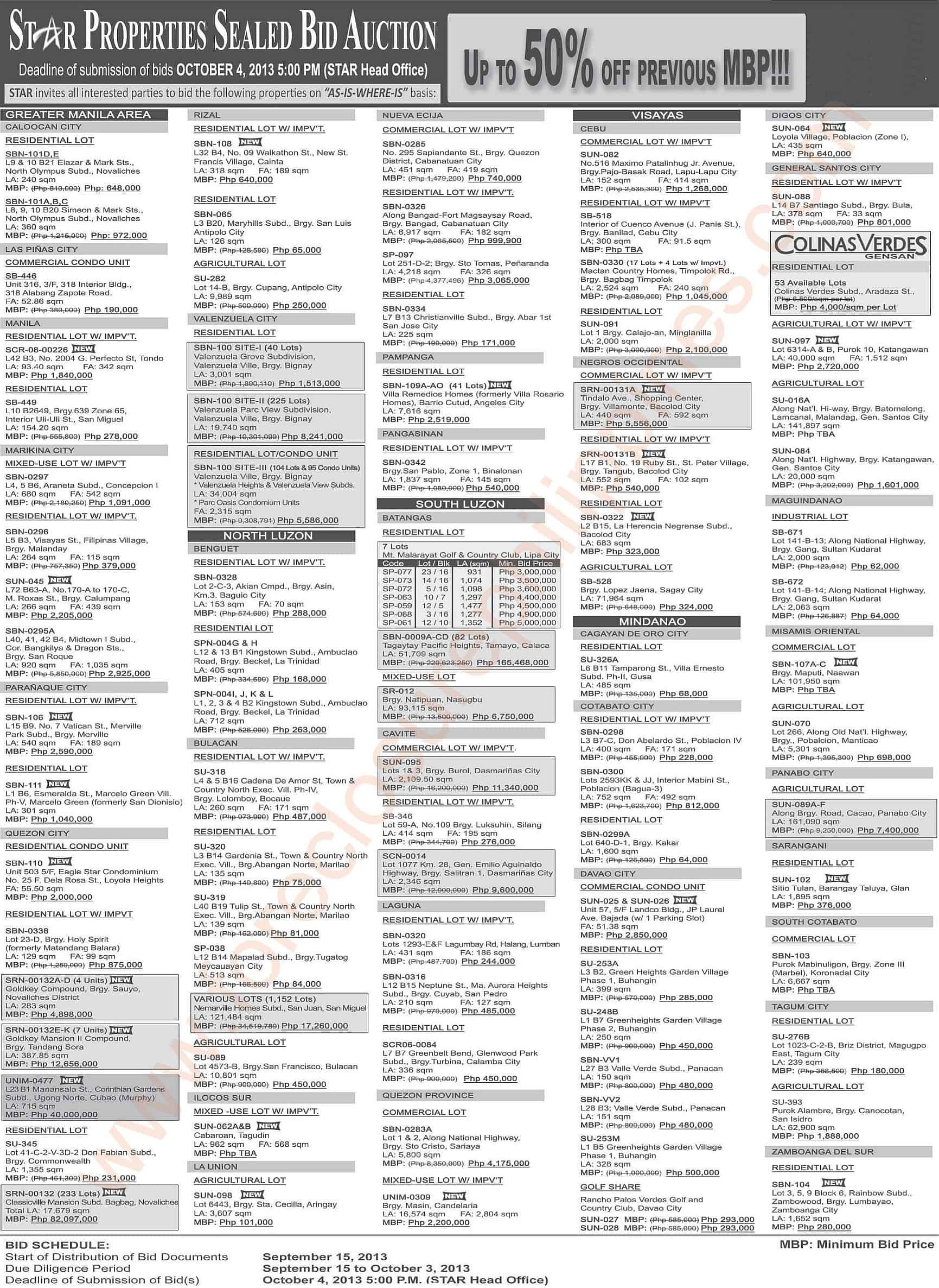 All interested parties are invited to participate in Star Properties’ Sealed Bidding Auction of foreclosed properties where bidders can get up to 50% off from the previous minimum bid price (MBP). The deadline of submission of bids will be on October 4, 2013, 5:00 PM, at the Star Head office. An overview of the sealed bidding, the complete listing of foreclosed properties for sale, and contact details can be found below.