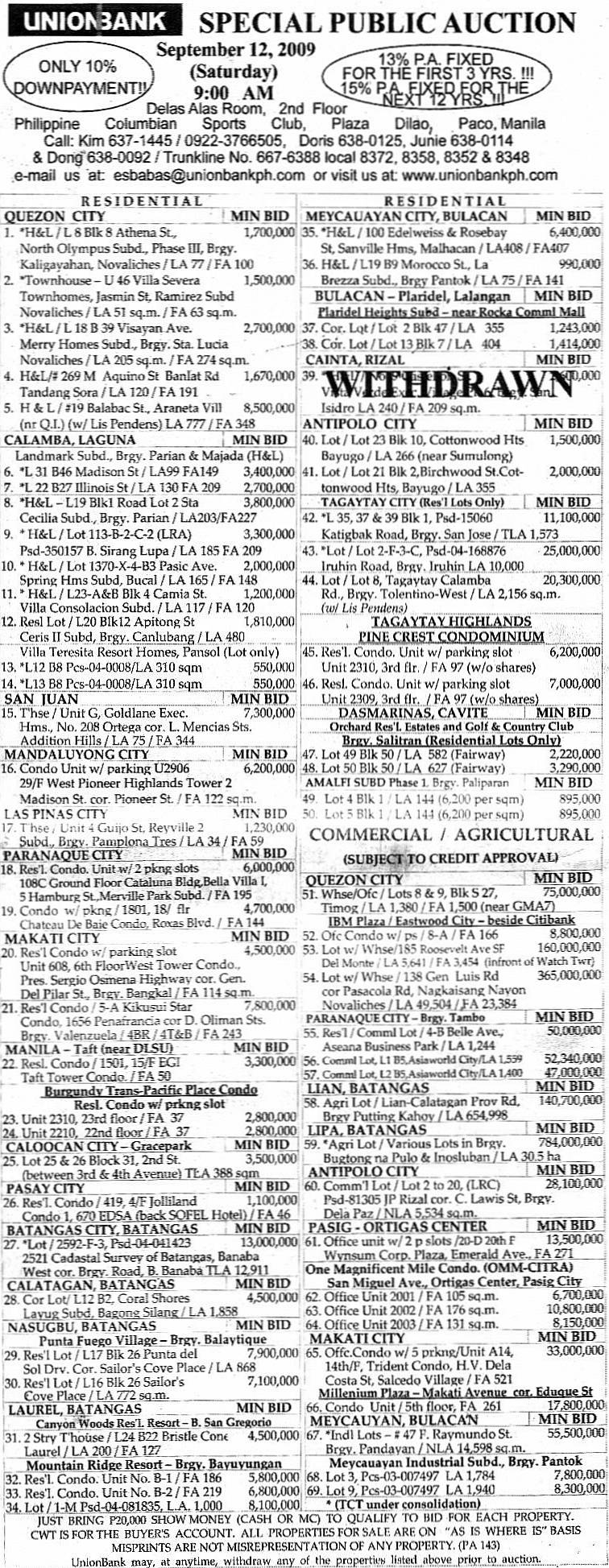 UnionBank shall be having its 143rd public auction of bank repossessed properties on September 12, 2009, Saturday, 9:00 AM. Venue shall be the Delas Alas Room at the 2nd floor of the Philippine Columbian Sports Club, Plaza Dilao, Paco, Manila, Philippines.